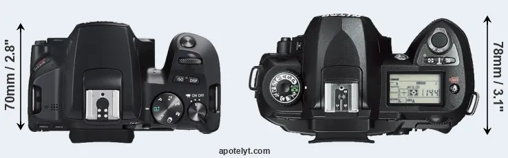 The physical size and weight of the Canon SL3 and the Nikon D70s are illustrated in the side-by-side display below. The two cameras are presented according to their relative size. Three consecutive perspectives from the front, the top, and the back are available. All size dimensions are rounded to the nearest millimeter.