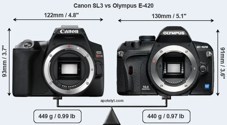 Going beyond this snapshot of core features and characteristics, what are the differences between the Canon EOS Rebel SL3 and the Olympus E-420? Which one should you buy? Read on to find out how these two cameras compare with respect to their body size, their imaging sensors, their shooting features, their input-output connections, and their reception by expert reviewers.