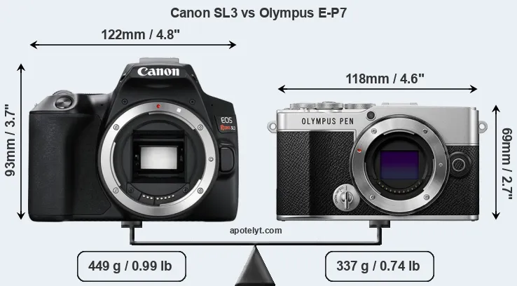 An illustration of the physical size and weight of the Canon SL3 and the Olympus E-P7 is provided in the side-by-side display below. The two cameras are presented according to their relative size. Three consecutive views from the front, the top, and the rear side are shown. All width, height and depth measures are rounded to the nearest millimeter.