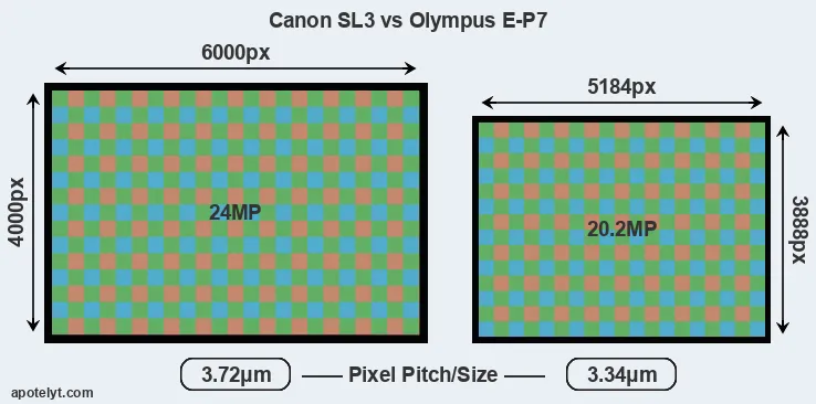 With 24MP, the SL3 offers a higher resolution than the E-P7 (20.2MP), but the SL3 nevertheless has larger individual pixels (pixel pitch of 3.72μm versus 3.34μm for the E-P7) due to its larger sensor. However, the E-P7 is a much more recent model (by 2 years and 2 months) than the SL3, and its sensor will have benefitted from technological advances during this time that further enhance the light gathering capacity of its pixels.