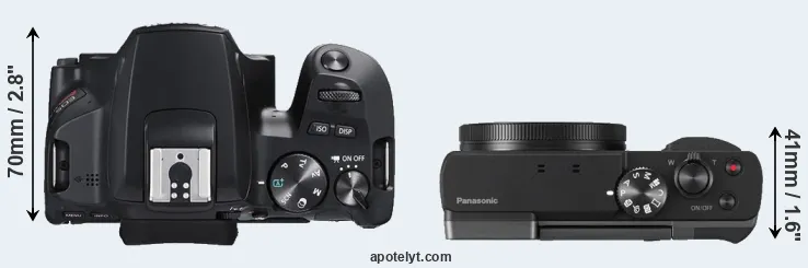 The side-by-side display below illustrates the physical size and weight of the Canon SL3 and the Panasonic ZS70. The two cameras are presented according to their relative size. Three consecutive perspectives from the front, the top, and the back are available. All width, height and depth measures are rounded to the nearest millimeter.