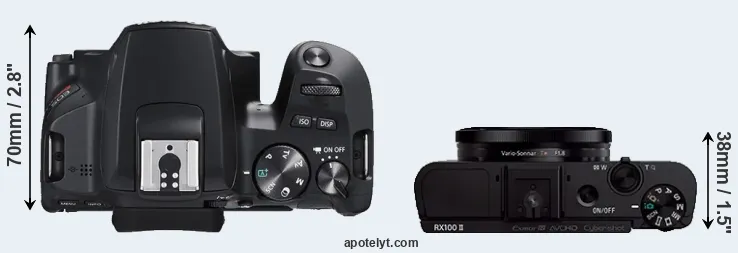 An illustration of the physical size and weight of the Canon SL3 and the Sony RX100 II is provided in the side-by-side display below. The two cameras are presented according to their relative size. Three consecutive perspectives from the front, the top, and the back are available. All width, height and depth dimensions are rounded to the nearest millimeter.