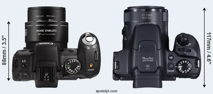 | 2. | Canon SX70 | 127 mm | 91 mm | 117 mm | 608 g | 325 | n | Sep 2018 | US$ 549 | amazon.com | |