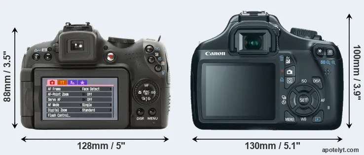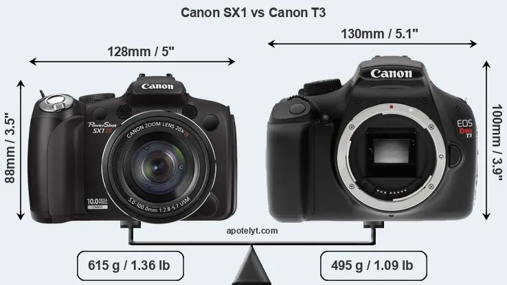 An illustration of the physical size and weight of the Canon SX1 and the Canon T3 is provided in the side-by-side display below. The two cameras are presented according to their relative size. Three successive views from the front, the top, and the rear are shown. All width, height and depth dimensions are rounded to the nearest millimeter.