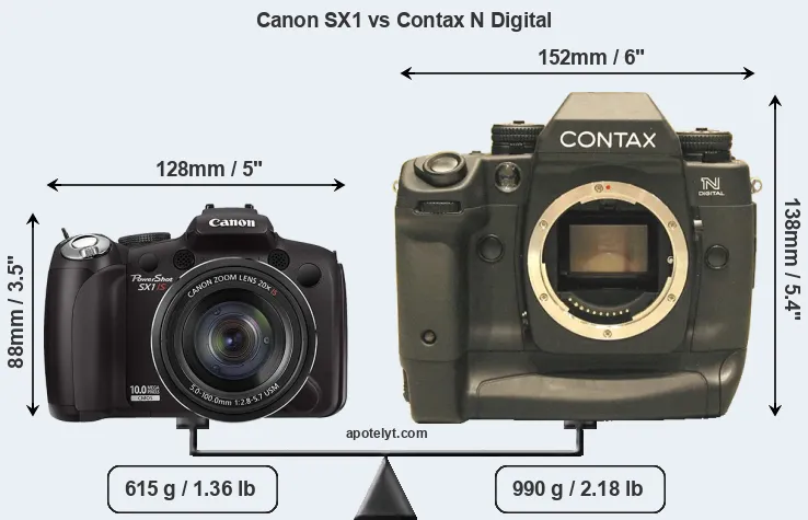 The side-by-side display below illustrates the physical size and weight of the Canon SX1 and the Contax N Digital. The two cameras are presented according to their relative size. Three consecutive perspectives from the front, the top, and the back are available. All width, height and depth dimensions are rounded to the nearest millimeter.