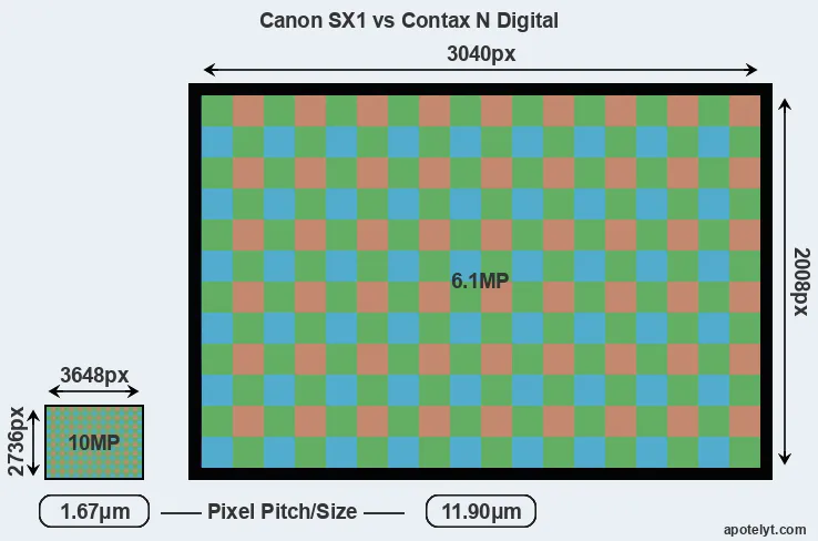 Despite having a smaller sensor, the Canon SX1 offers a higher resolution of 10 megapixels, compared with 6.1 MP of the Contax N Digital. This megapixels advantage comes at the cost of a higher pixel density and a smaller size of the individual pixel (with a pixel pitch of 1.67μm versus 11.90μm for the N Digital). However, it should be noted that the SX1 is much more recent (by 6 years and 6 months) than the N Digital, and its sensor will have benefitted from technological advances during this time that make it possible to gather light more efficiently. Coming back to sensor resolution, it should be mentioned that the SX1 has no anti-alias filter installed, so that it can capture all the detail its sensor resolves.