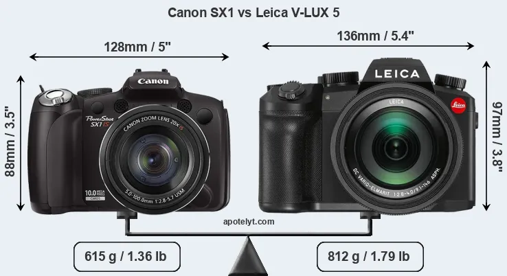 If the front view area (width x height) of the cameras is taken as an aggregate measure of their size, the Leica V-LUX 5 is notably larger (17 percent) than the Canon SX1. Moreover, the V-LUX 5 is markedly heavier (32 percent) than the SX1. In this context, it is worth noting that neither the SX1 nor the V-LUX 5 are weather-sealed.