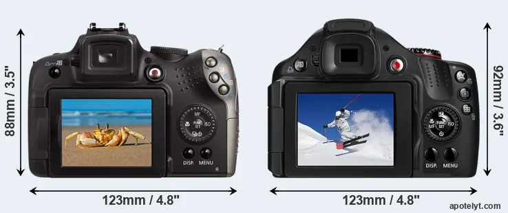 The physical size and weight of the Canon SX20 and the Canon SX30 are illustrated in the side-by-side display below. The two cameras are presented according to their relative size. Three consecutive views from the front, the top, and the rear side are shown. All size dimensions are rounded to the nearest millimeter.