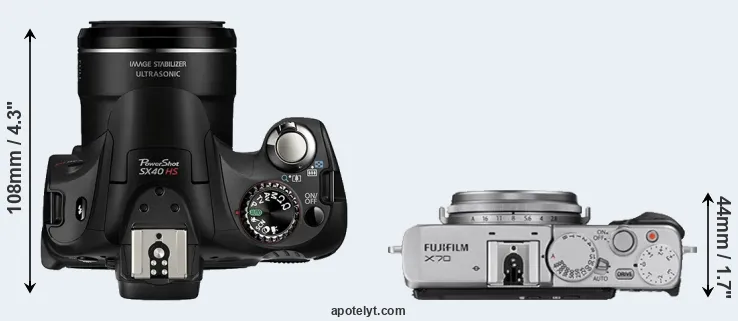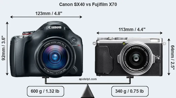 An illustration of the physical size and weight of the Canon SX40 and the Fujifilm X70 is provided in the side-by-side display below. The two cameras are presented according to their relative size. Three successive views from the front, the top, and the rear are shown. All width, height and depth dimensions are rounded to the nearest millimeter.