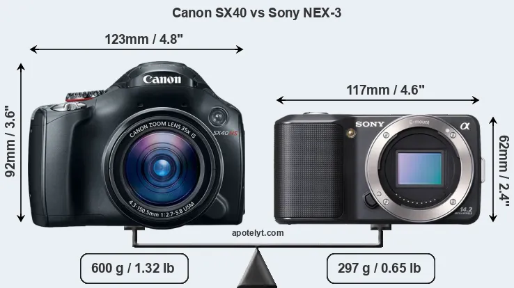 An illustration of the physical size and weight of the Canon SX40 and the Sony NEX-3 is provided in the side-by-side display below. The two cameras are presented according to their relative size. Three consecutive views from the front, the top, and the rear side are shown. All size dimensions are rounded to the nearest millimeter.