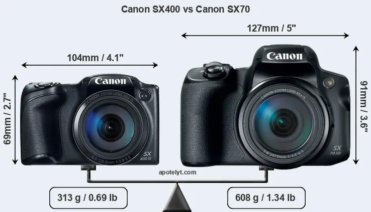If the front view area (width x height) of the cameras is taken as an aggregate measure of their size, the Canon SX70 is considerably larger (61 percent) than the Canon SX400. Moreover, the SX70 is substantially heavier (94 percent) than the SX400. In this context, it is worth noting that neither the SX400 nor the SX70 are weather-sealed.