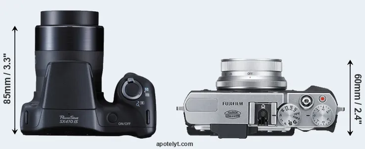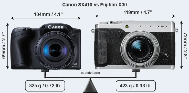 The side-by-side display below illustrates the physical size and weight of the Canon SX410 and the Fujifilm X30. The two cameras are presented according to their relative size. Three consecutive perspectives from the front, the top, and the back are available. All size dimensions are rounded to the nearest millimeter.