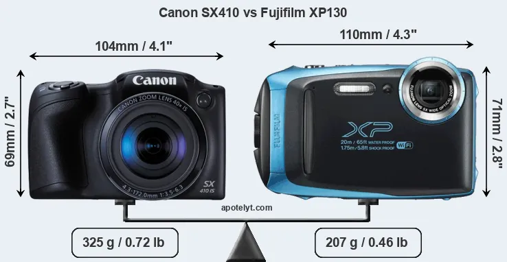 An illustration of the physical size and weight of the Canon SX410 and the Fujifilm XP130 is provided in the side-by-side display below. The two cameras are presented according to their relative size. Three successive views from the front, the top, and the rear are shown. All width, height and depth dimensions are rounded to the nearest millimeter.