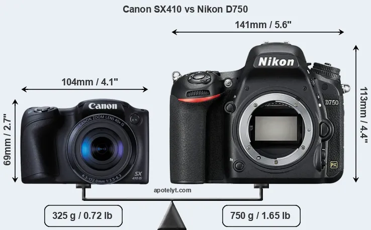 An illustration of the physical size and weight of the Canon SX410 and the Nikon D750 is provided in the side-by-side display below. The two cameras are presented according to their relative size. Three successive views from the front, the top, and the rear are shown. All width, height and depth dimensions are rounded to the nearest millimeter.
