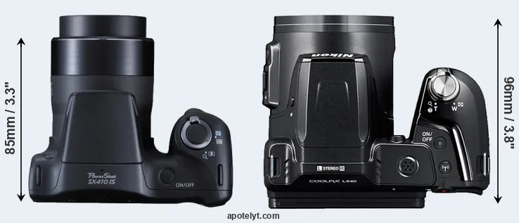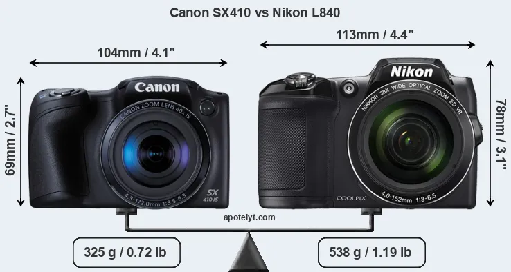 The side-by-side display below illustrates the physical size and weight of the Canon SX410 and the Nikon L840. The two cameras are presented according to their relative size. Three consecutive views from the front, the top, and the rear side are shown. All width, height and depth dimensions are rounded to the nearest millimeter.