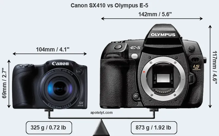 If the front view area (width x height) of the cameras is taken as an aggregate measure of their size, the Olympus E-5 is considerably larger (132 percent) than the Canon SX410. It is noteworthy in this context that the E-5 is splash and dust-proof, while the SX410 does not feature any corresponding weather-sealing.