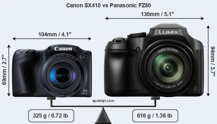 The side-by-side display below illustrates the physical size and weight of the Canon SX410 and the Panasonic FZ80. The two cameras are presented according to their relative size. Three consecutive views from the front, the top, and the rear side are shown. All width, height and depth dimensions are rounded to the nearest millimeter.