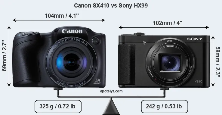 The physical size and weight of the Canon SX410 and the Sony HX99 are illustrated in the side-by-side display below. The two cameras are presented according to their relative size. Three consecutive views from the front, the top, and the rear side are shown. All size dimensions are rounded to the nearest millimeter.