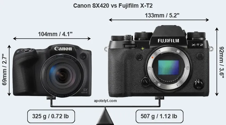 An illustration of the physical size and weight of the Canon SX420 and the Fujifilm X-T2 is provided in the side-by-side display below. The two cameras are presented according to their relative size. Three consecutive views from the front, the top, and the rear side are shown. All width, height and depth measures are rounded to the nearest millimeter.