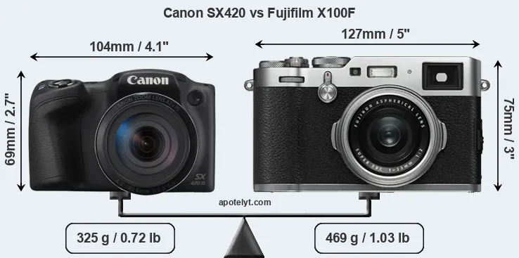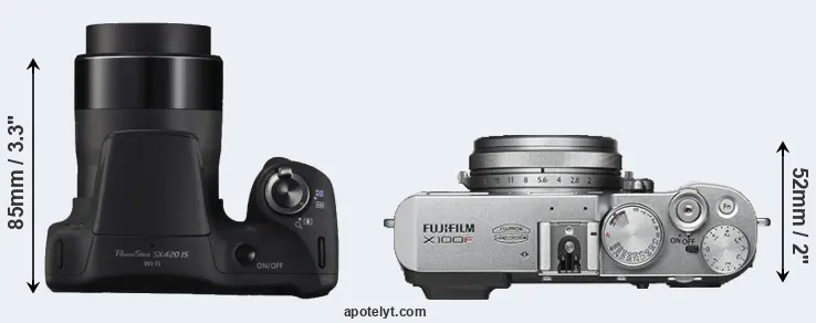 An illustration of the physical size and weight of the Canon SX420 and the Fujifilm X100F is provided in the side-by-side display below. The two cameras are presented according to their relative size. Three consecutive views from the front, the top, and the rear side are shown. All width, height and depth measures are rounded to the nearest millimeter.