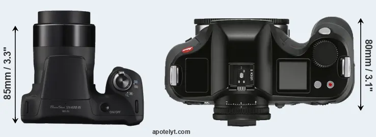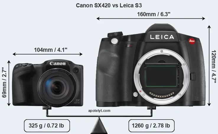 An illustration of the physical size and weight of the Canon SX420 and the Leica S3 is provided in the side-by-side display below. The two cameras are presented according to their relative size. Three successive views from the front, the top, and the rear are shown. All width, height and depth measures are rounded to the nearest millimeter.