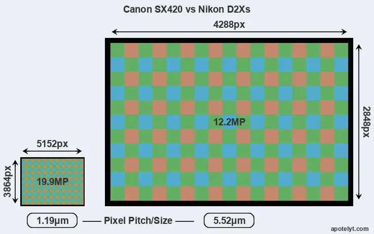 Despite having a smaller sensor, the Canon SX420 offers a higher resolution of 19.9 megapixels, compared with 12.2 MP of the Nikon D2Xs. This megapixels advantage comes at the cost of a higher pixel density and a smaller size of the individual pixel (with a pixel pitch of 1.19μm versus 5.52μm for the D2Xs). However, it should be noted that the SX420 is much more recent (by 9 years and 7 months) than the D2Xs, and its sensor will have benefitted from technological advances during this time that make it possible to gather light more efficiently. Coming back to sensor resolution, it should be mentioned that the SX420 has no anti-alias filter installed, so that it can capture all the detail its sensor resolves.