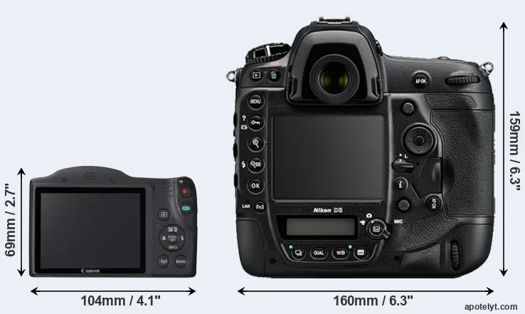 The physical size and weight of the Canon SX420 and the Nikon D5 are illustrated in the side-by-side display below. The two cameras are presented according to their relative size. Three consecutive perspectives from the front, the top, and the back are available. All width, height and depth dimensions are rounded to the nearest millimeter.