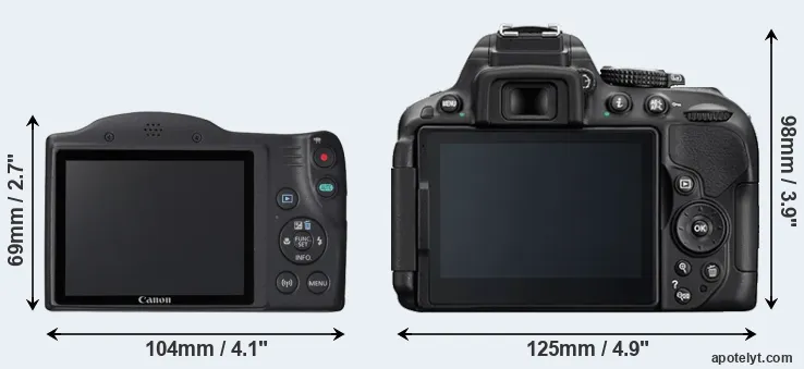 The above size and weight comparisons are to some extent incomplete and possibly misleading, as the SX420 has a lens built in, whereas the D5300 is an interchangeable lens camera that requires a separate lens. Attaching the latter will add extra weight and bulk to the setup. You can compare the optics available for the D5300 and their specifications in the Nikon Lens Catalog.