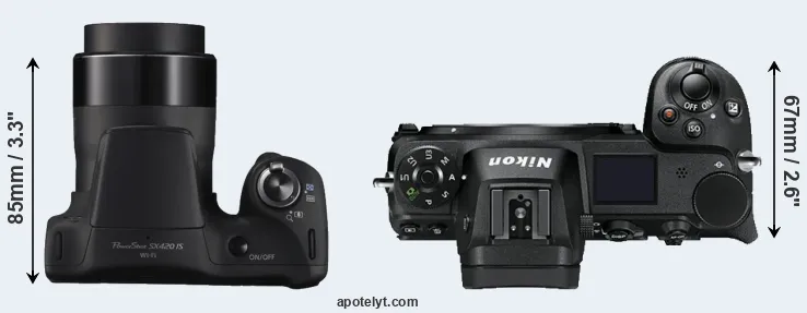 The side-by-side display below illustrates the physical size and weight of the Canon SX420 and the Nikon Z7. The two cameras are presented according to their relative size. Three consecutive perspectives from the front, the top, and the back are available. All width, height and depth dimensions are rounded to the nearest millimeter.