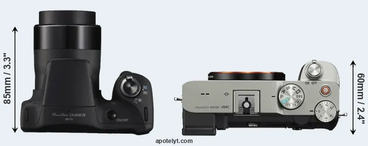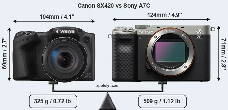 The side-by-side display below illustrates the physical size and weight of the Canon SX420 and the Sony A7C. The two cameras are presented according to their relative size. Three consecutive perspectives from the front, the top, and the back are available. All size dimensions are rounded to the nearest millimeter.