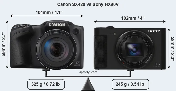 The physical size and weight of the Canon SX420 and the Sony HX90V are illustrated in the side-by-side display below. The two cameras are presented according to their relative size. Three successive views from the front, the top, and the rear are shown. All size dimensions are rounded to the nearest millimeter.