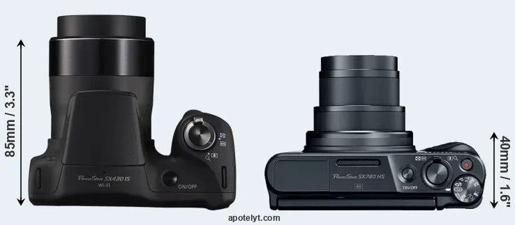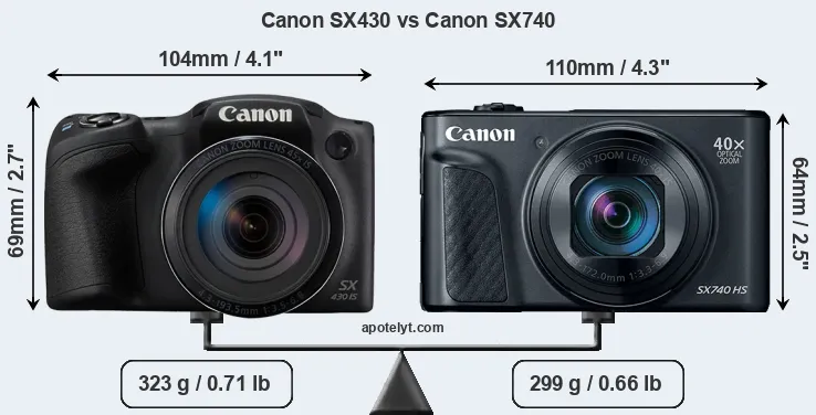 An illustration of the physical size and weight of the Canon SX430 and the Canon SX740 is provided in the side-by-side display below. The two cameras are presented according to their relative size. Three consecutive perspectives from the front, the top, and the back are available. All width, height and depth dimensions are rounded to the nearest millimeter.