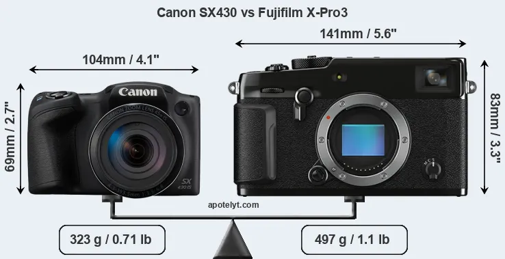 The physical size and weight of the Canon SX430 and the Fujifilm X-Pro3 are illustrated in the side-by-side display below. The two cameras are presented according to their relative size. Three consecutive perspectives from the front, the top, and the back are available. All width, height and depth measures are rounded to the nearest millimeter.