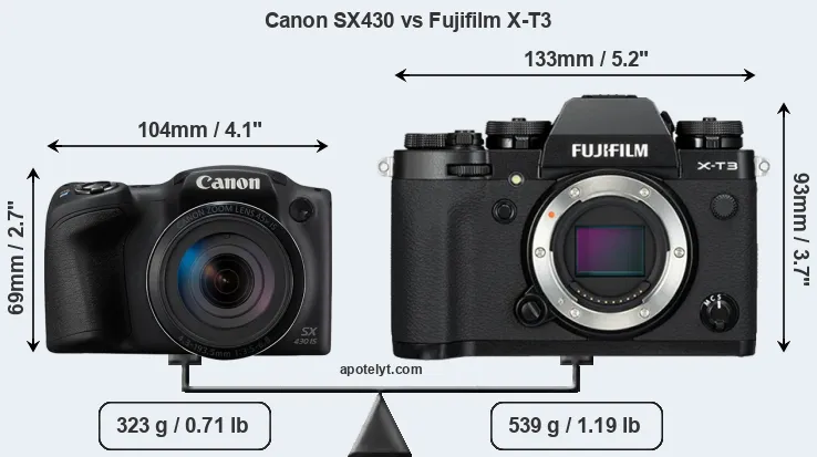 An illustration of the physical size and weight of the Canon SX430 and the Fujifilm X-T3 is provided in the side-by-side display below. The two cameras are presented according to their relative size. Three consecutive perspectives from the front, the top, and the back are available. All size dimensions are rounded to the nearest millimeter.