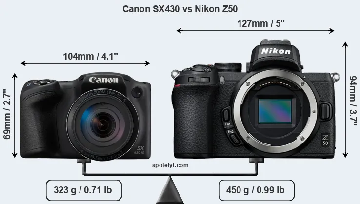 The physical size and weight of the Canon SX430 and the Nikon Z50 are illustrated in the side-by-side display below. The two cameras are presented according to their relative size. Three successive views from the front, the top, and the rear are shown. All width, height and depth dimensions are rounded to the nearest millimeter.