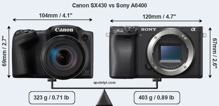 If the front view area (width x height) of the cameras is taken as an aggregate measure of their size, the Sony A6400 is notably larger (12 percent) than the Canon SX430. It is noteworthy in this context that the A6400 is splash and dust-proof, while the SX430 does not feature any corresponding weather-sealing.