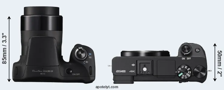 An illustration of the physical size and weight of the Canon SX430 and the Sony A6400 is provided in the side-by-side display below. The two cameras are presented according to their relative size. Three consecutive perspectives from the front, the top, and the back are available. All width, height and depth measures are rounded to the nearest millimeter.