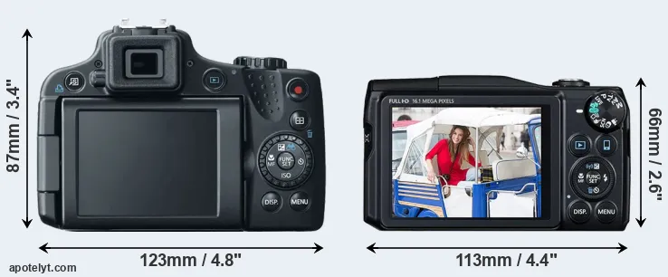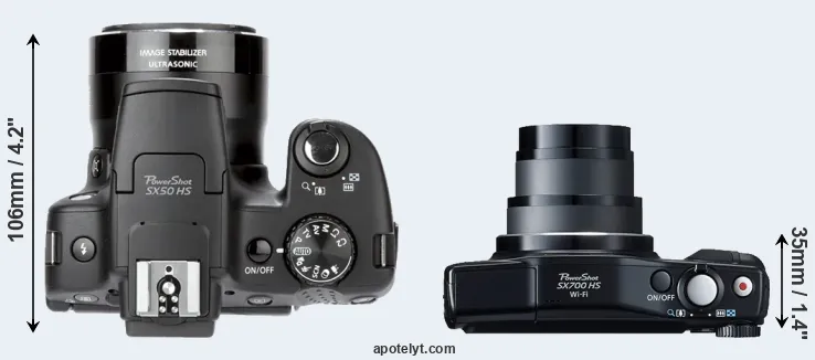 The side-by-side display below illustrates the physical size and weight of the Canon SX50 and the Canon SX700. The two cameras are presented according to their relative size. Three consecutive perspectives from the front, the top, and the back are available. All width, height and depth dimensions are rounded to the nearest millimeter.