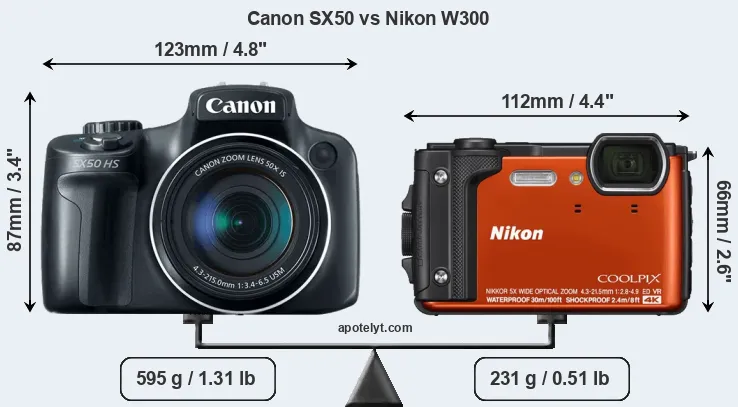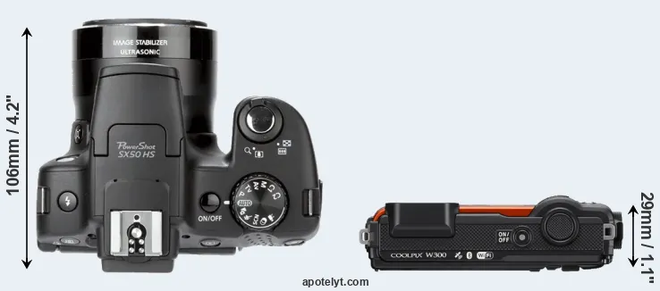 The side-by-side display below illustrates the physical size and weight of the Canon SX50 and the Nikon W300. The two cameras are presented according to their relative size. Three consecutive perspectives from the front, the top, and the back are available. All width, height and depth dimensions are rounded to the nearest millimeter.