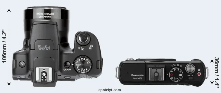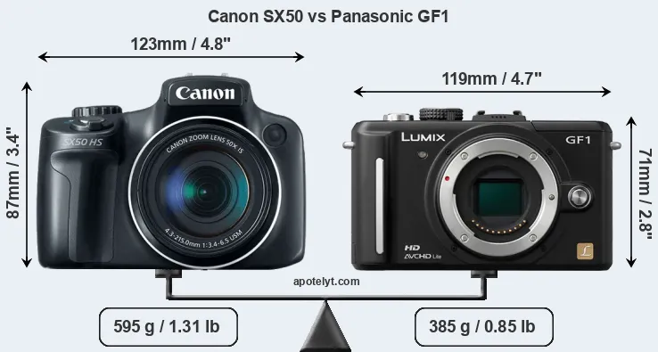 An illustration of the physical size and weight of the Canon SX50 and the Panasonic GF1 is provided in the side-by-side display below. The two cameras are presented according to their relative size. Three successive views from the front, the top, and the rear are shown. All width, height and depth dimensions are rounded to the nearest millimeter.