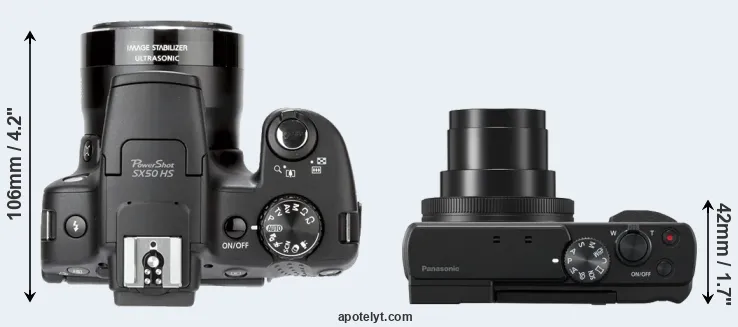 The side-by-side display below illustrates the physical size and weight of the Canon SX50 and the Panasonic ZS80. The two cameras are presented according to their relative size. Three consecutive views from the front, the top, and the rear side are shown. All width, height and depth measures are rounded to the nearest millimeter.