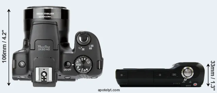 The physical size and weight of the Canon SX50 and the Sony NEX-3 are illustrated in the side-by-side display below. The two cameras are presented according to their relative size. Three consecutive views from the front, the top, and the rear side are shown. All size dimensions are rounded to the nearest millimeter.