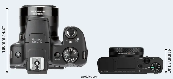 The side-by-side display below illustrates the physical size and weight of the Canon SX50 and the Sony RX100 IV. The two cameras are presented according to their relative size. Three successive views from the front, the top, and the rear are shown. All size dimensions are rounded to the nearest millimeter.