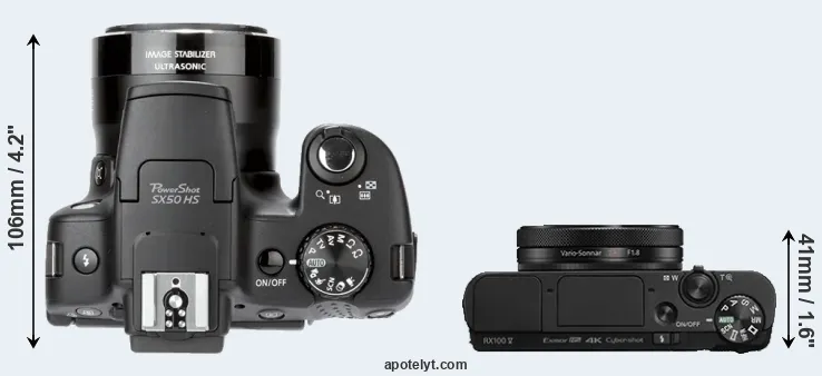 The side-by-side display below illustrates the physical size and weight of the Canon SX50 and the Sony RX100 V. The two cameras are presented according to their relative size. Three successive views from the front, the top, and the rear are shown. All size dimensions are rounded to the nearest millimeter.