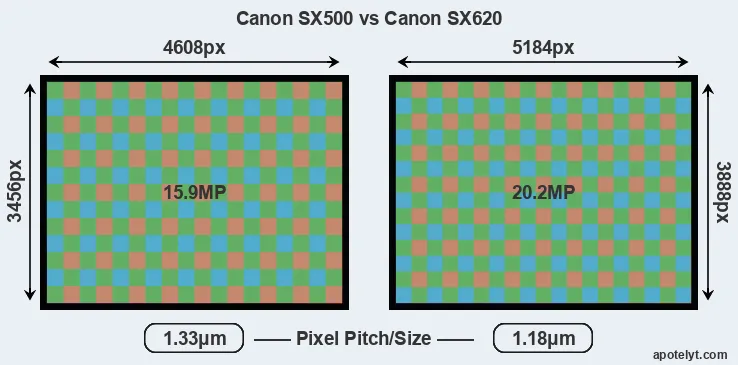 While the two cameras under review share the same sensor size, the SX620 offers a higher resolution of 20.2 megapixels, compared with 15.9 MP of the SX500. This megapixels advantage translates into a 13 percent gain in linear resolution. On the other hand, these sensor specs imply that the SX620 has a higher pixel density and a smaller size of the individual pixel (with a pixel pitch of 1.18μm versus 1.33μm for the SX500). However, it should be noted that the SX620 is much more recent (by 3 years and 8 months) than the SX500, and its sensor will have benefitted from technological advances during this time that compensate for the smaller pixel size. Coming back to sensor resolution, it should be mentioned that neither of the two cameras has an anti-alias filter installed, so they are able to capture all the detail the sensor resolves.