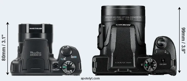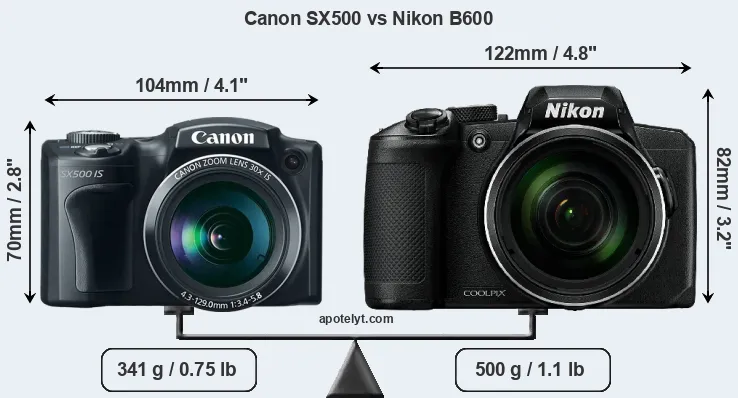 The physical size and weight of the Canon SX500 and the Nikon B600 are illustrated in the side-by-side display below. The two cameras are presented according to their relative size. Three consecutive views from the front, the top, and the rear side are shown. All size dimensions are rounded to the nearest millimeter.