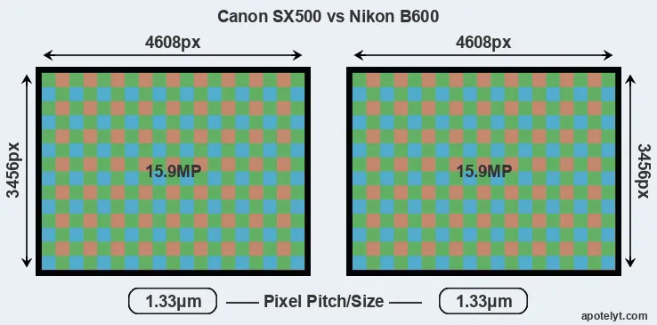 | Sensor Specs | Canon SX500 | Nikon B600 |