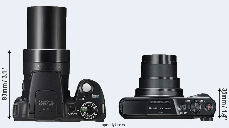 The physical size and weight of the Canon SX510 and the Canon SX720 are illustrated in the side-by-side display below. The two cameras are presented according to their relative size. Three successive views from the front, the top, and the rear are shown. All width, height and depth measures are rounded to the nearest millimeter.