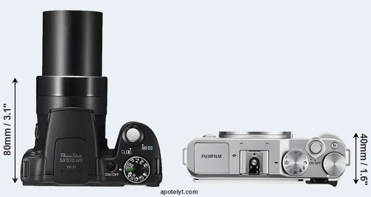 The physical size and weight of the Canon SX510 and the Fujifilm X-A3 are illustrated in the side-by-side display below. The two cameras are presented according to their relative size. Three consecutive perspectives from the front, the top, and the back are available. All width, height and depth measures are rounded to the nearest millimeter.
