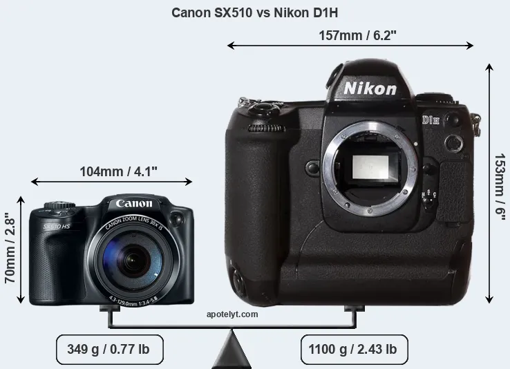 If the front view area (width x height) of the cameras is taken as an aggregate measure of their size, the Nikon D1H is considerably larger (230 percent) than the Canon SX510. It is noteworthy in this context that the D1H is splash and dust-proof, while the SX510 does not feature any corresponding weather-sealing.